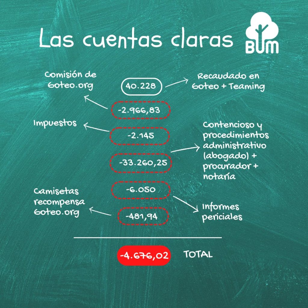 En mayo de 2025, la Plataforma tenía pendiente de pago una importante suma de dinero, principalmente para hacer frente a los costes judiciales que preservan los terrenos públicos del BUM de la especulación financiera e inmobiliaria.